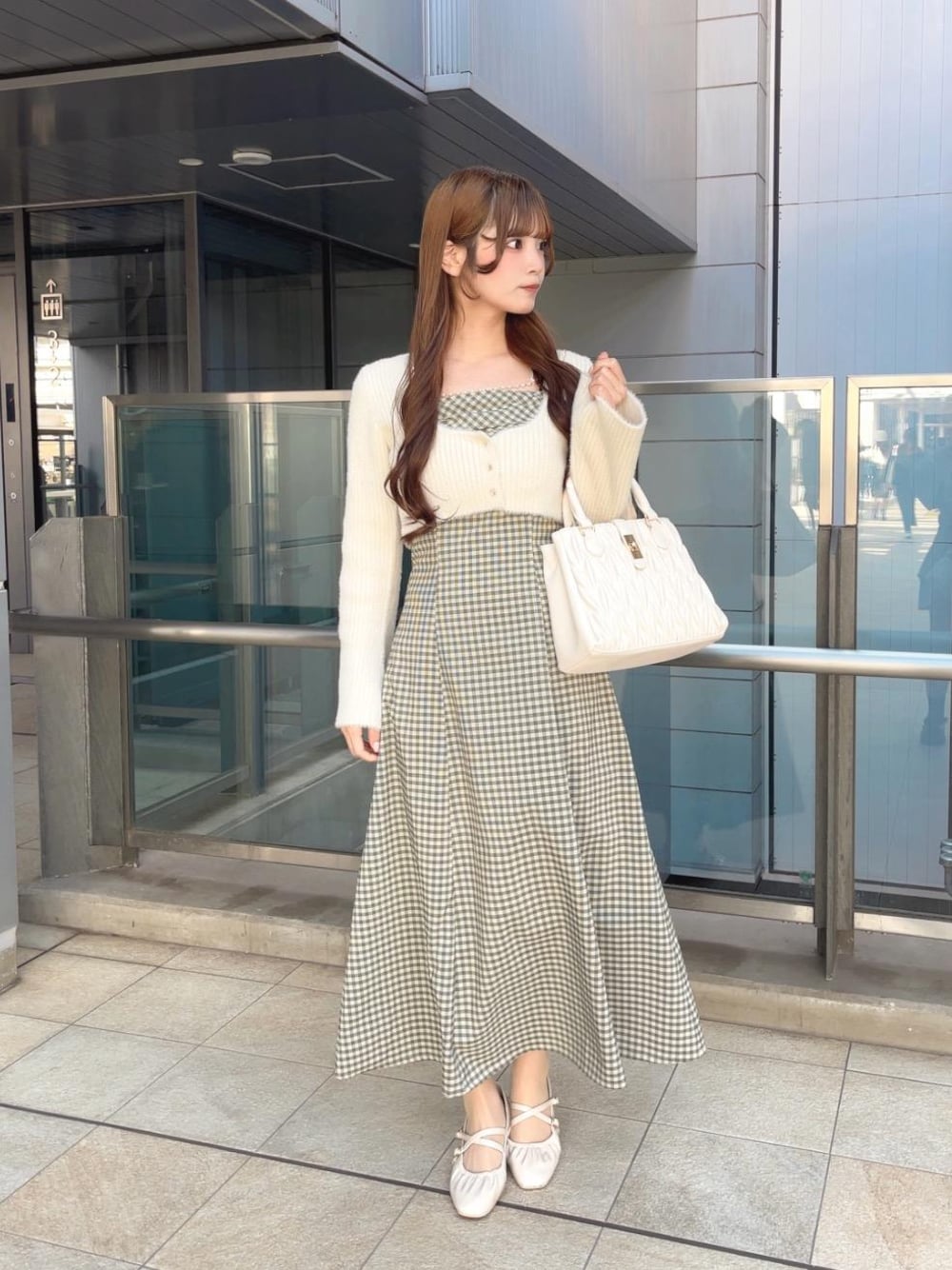 ふわふわカーデがセットのワンピーする🎀 形めっちゃきれいで細見えする♡ 小物も色味合わせて統一感出してます✨