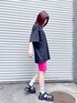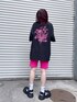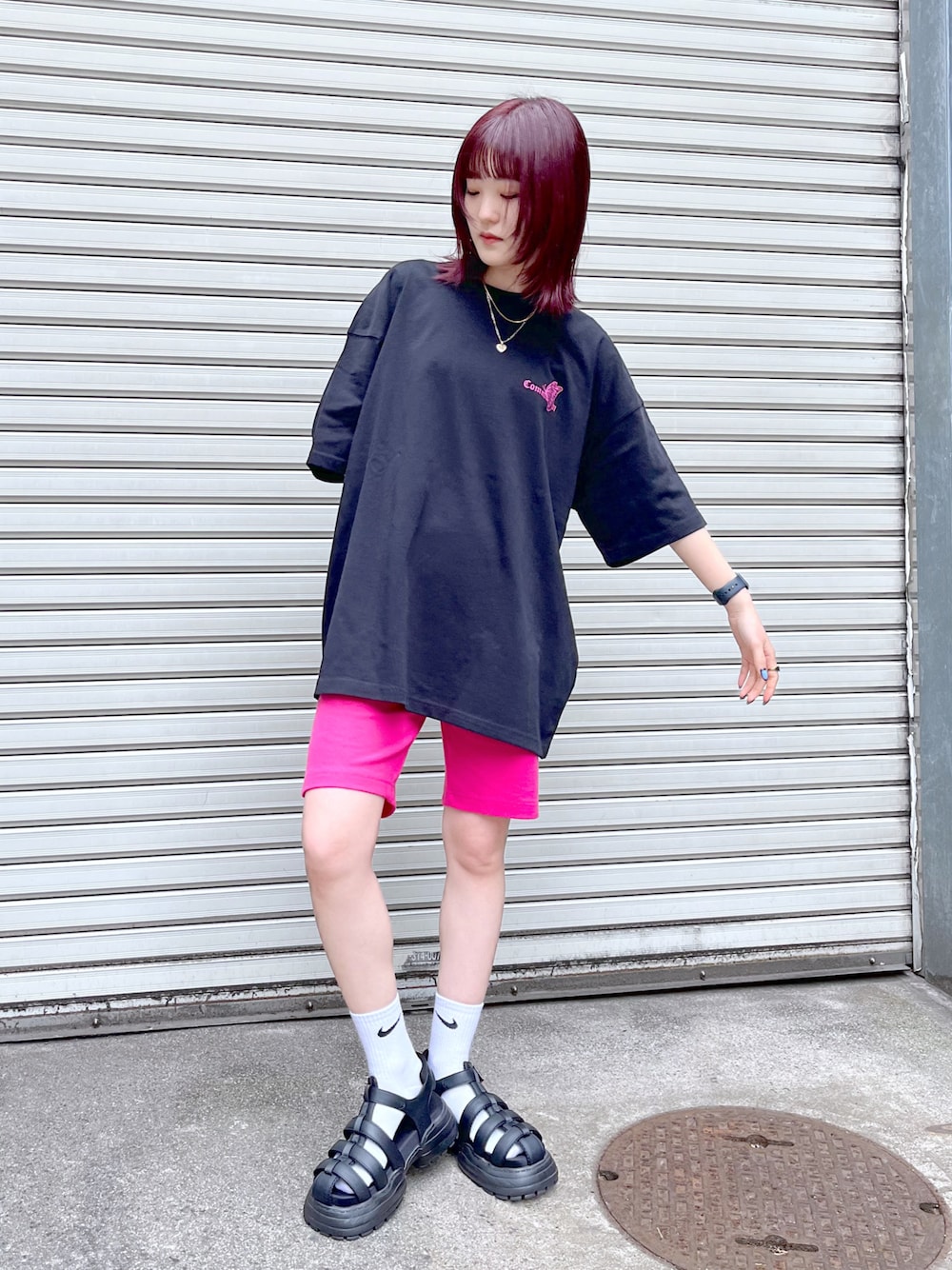 ブラック×ピンクコーデ 韓国っぽなプリントが印象的な《バタフライフラワーT》 Lサイズ着用でお尻が隠れる丈感だったので、ミニボトムスと合わせてきても◎✨ パキッとピンクが目を惹きますね🥹