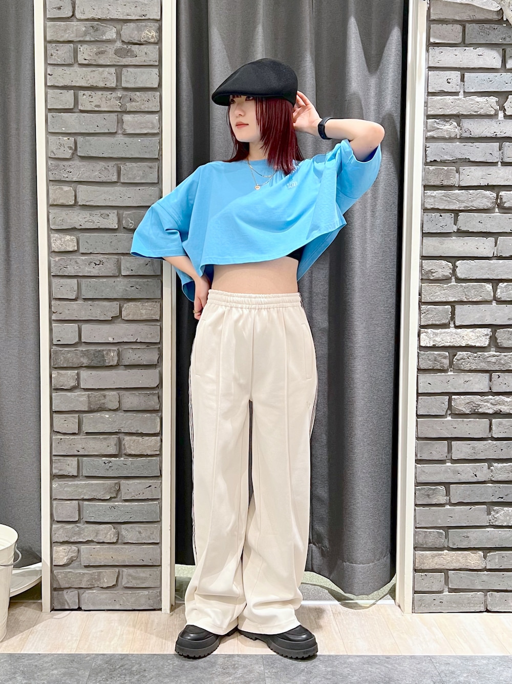 トレンドのジャージパンツも、ショート丈Tシャツと合わせてオシャ楽に✨ LIMのTシャツはいつも生地感しっかりしていて、透け感も気にならないので嬉しいです🎶