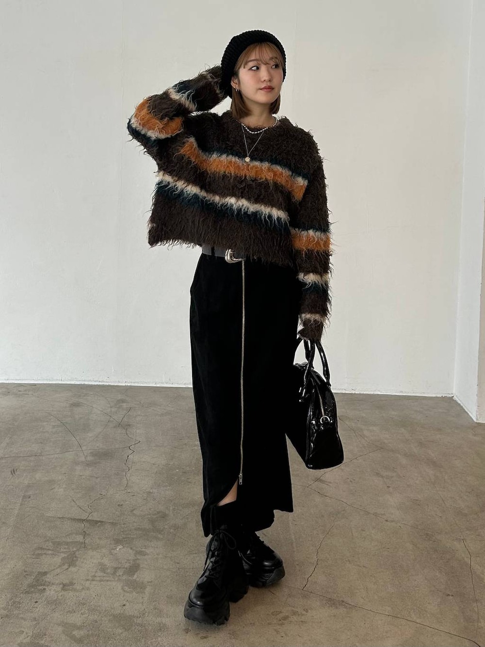 冬の大人カジュアルコーデ 【トップス】 ふわふわの肌触りで、着心地◎のニット 太めのボーダーが存在感ありショート丈なので着膨れも気にならない✨ 【スカート】 センタージップのデザインがモードらしさを演出できるスカート。 ジップ調節で抜け感も出せるので、女性らしさも◎