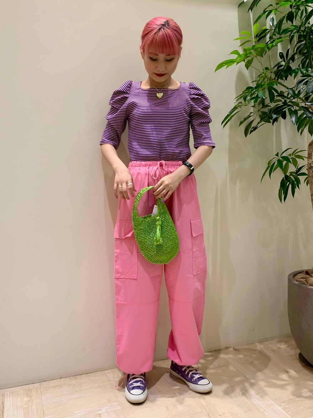 ピンクコーデをご紹介いたします! 店頭でも大変人気のテレコボーダーTシャツをメインで着てみました!顔まわりにボリュームがあるものを持ってくると小顔効果もあるので嬉しいです🥹💖 パンツは裾を絞って履くことができるので形を変えて色々履けるのが楽しいですよ!カラーも派手すぎないピンクで絶妙に可愛いです!💖💖 Instagramも更新しております! @mainichiaripeii