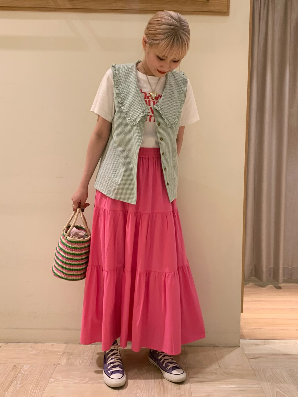 カラーコーデ!! ピンクのスカートが映えます!! ひらひらしててとっても可愛いコーデです!💖💖 トップスはノースリーブスでも着れます! Instagramも更新しています! @mainichiaripeii