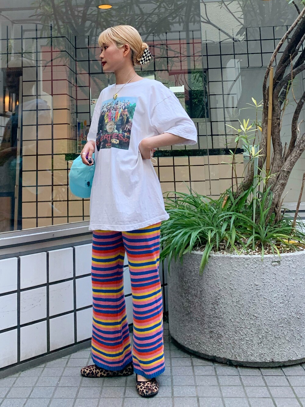メンズのバンドTシャツコーデ! メンズのTシャツをレディースの方でも着ていただけるのでカップルにもおすすめです💖💖 着用はMサイズです! ボーダーのカラーパンツを履いて遊び心のあるコーディネートに仕上げました!!🤭🤍 Instagramもフォローお願いします! @mainichiaripeii