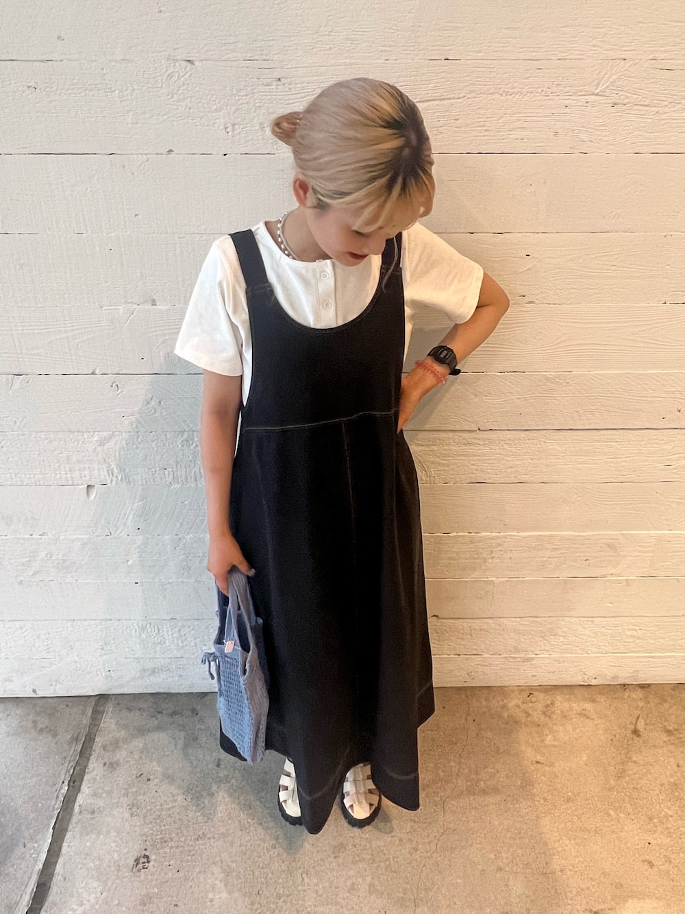 デニムワンピースコーデ!! 形もとても綺麗で、店頭でも大人気の商品です! ポケットが付いている利便性に加えて、ステッチがブラウンで、おしゃれさも抜群です❤️🔥 合わせたシャツはボタンが縦に並ぶミニ丈Tシャツです!タックインが苦手な方など、そのままで着ていただけるのでおすすめですよ! グルカサンダルは、マジックテープで止めて履けるので楽ちんです!! Instagramも更新しております! @mainichiaripeii