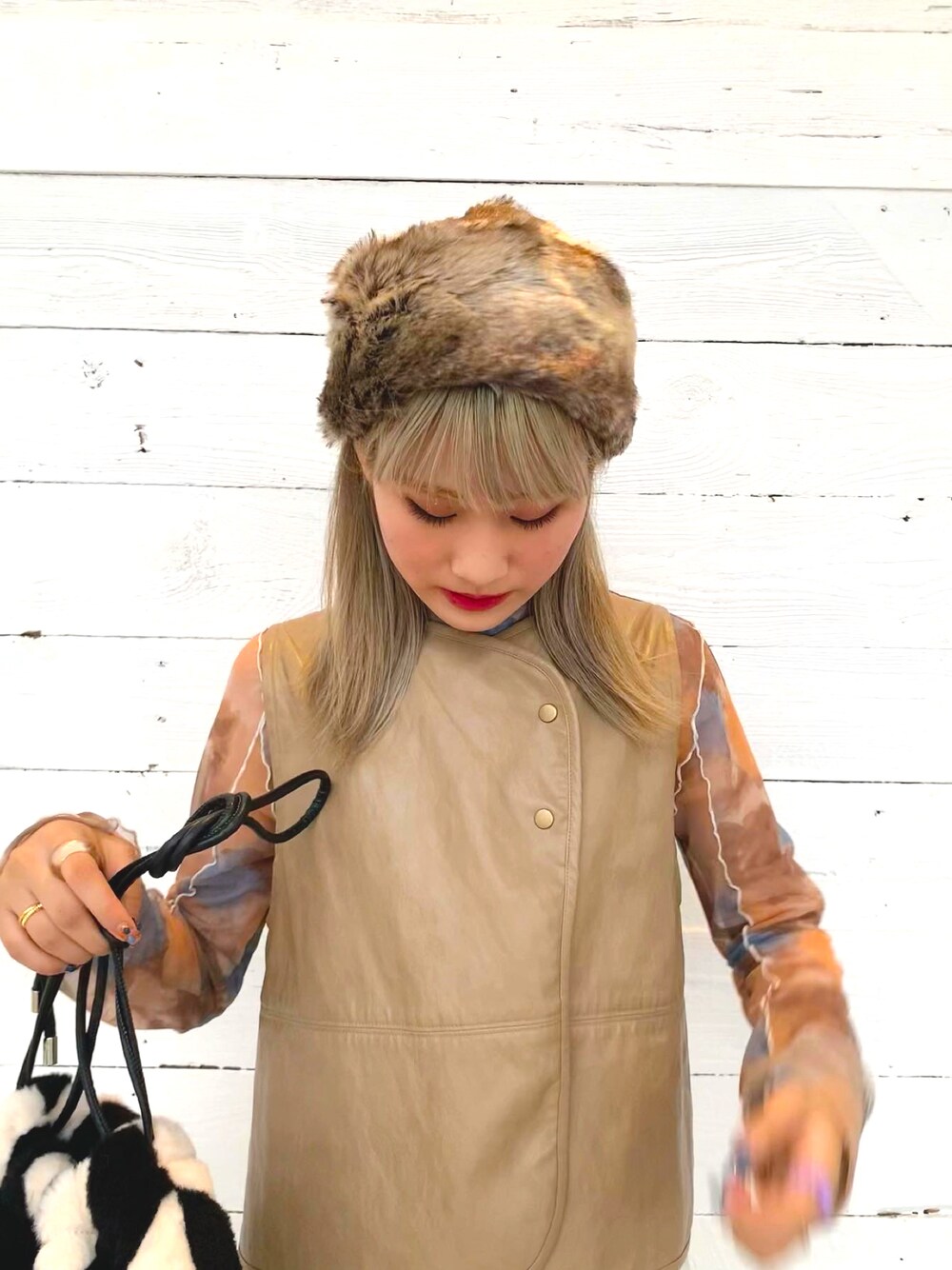 ボア帽子を使ったコーディネート! 冬はやっぱりもこもこです!!!🤍 シアートップスは今年のトレンドで、レザーのベストを合わせてみましたーー!! とっても可愛いコーデ気に入ってます!🧡 Instagramも更新しております! @mainichiaripeii