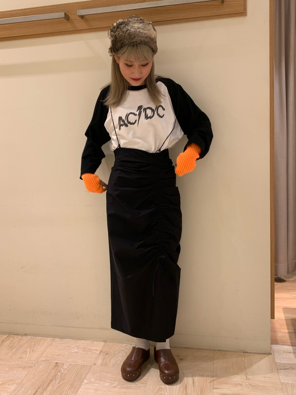 トレンドのアームウォーマーを使ったコーデ! アームウォーマーは一つは持っておきたいです!! 差し色にもなります!🧡 スカートは絞れるので形が変えられて楽しいです! バンドTシャツをきてカジュアルにしてみました!! Instagramも更新しております! @mainichiaripeii