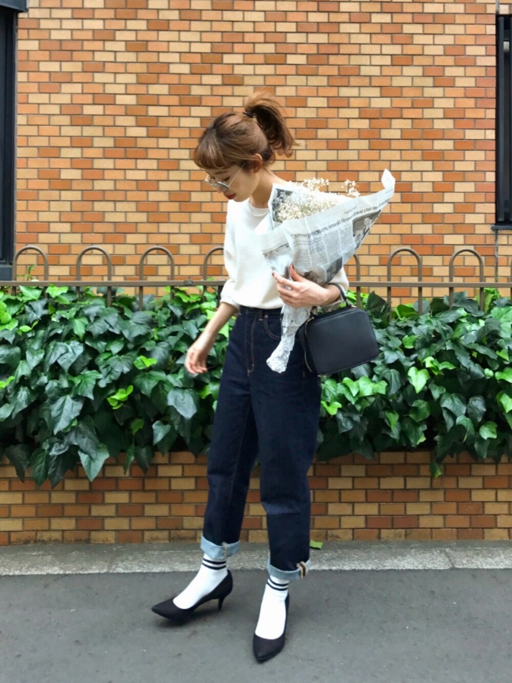 プチプラでまとめてもFUDGEの女の子になれました🇫🇷 あんまり見えないですがパールのネックレスは材料買ってきて自分で作りました🍪 ラインソックス可愛いな〜