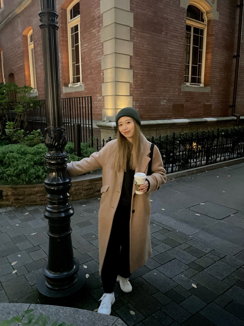 ビーニーは👨🏼🦱のを奪い取ってきた、アウターは気に入って何年も着てるもの、暗くてすみません、中はスウェットとスラックス、どちらもブラックです! Instagram@saeka_h