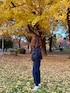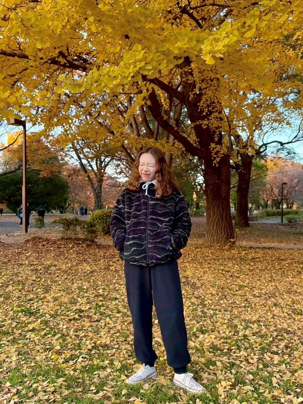 パープル系のジャケット/アウター、ブルー系のパンツを着用したレディースの秋コーディネートの1枚目の写真