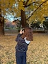 パープル系のジャケット/アウター、ブルー系のパンツを着用したレディースの秋コーディネートの3枚目の写真