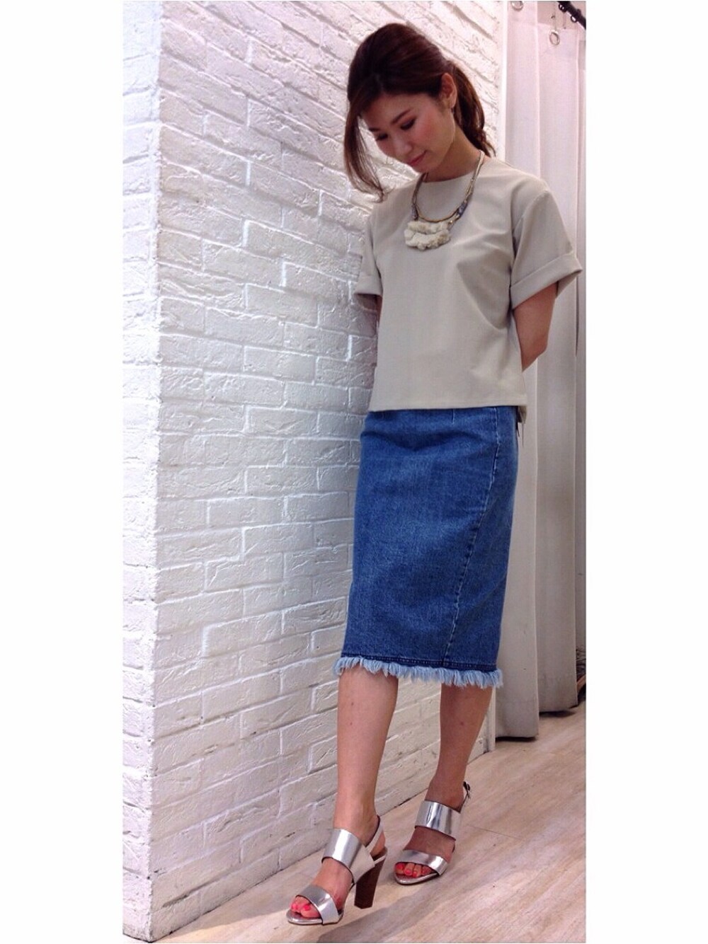 ミディ丈のデニムスカートでシンプルコーデ。 フリンジがお気に入りです♡!