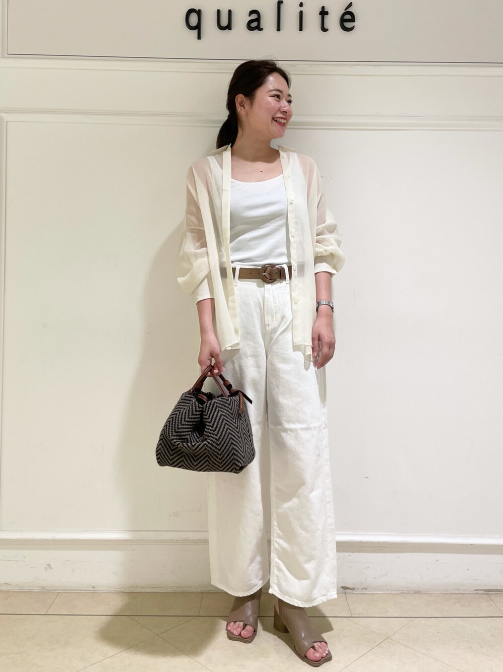 ご覧いただきありがとうございます🌼 今回は「ホワイト×ブラウン小物コーデ」です🤍🤎 シアーシャツを羽織で使うことによって軽さが出るのでこの時期でも着れます✨ デニムはカジュアルですが、ワントーンに統一することでキレイめなコーデになります😊 ベルト、靴、バッグをベージュにすることで、秋の先取りにもなるのでオススメです! 素材がナチュラルなので、きれいめになり過ぎず丁度良いバランスで着ていただけます!!