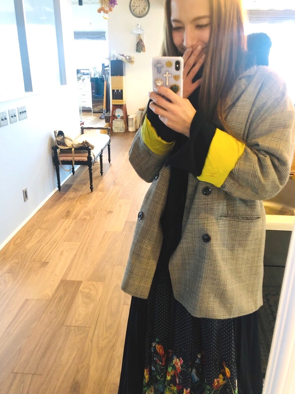 スザンヌのテーラードジャケット「<高橋愛さんコラボ>ラブ&ピースプロジェクト 裏地配色がかわいいチェック柄のダブルボタンジャケット」を使ったコーディネート