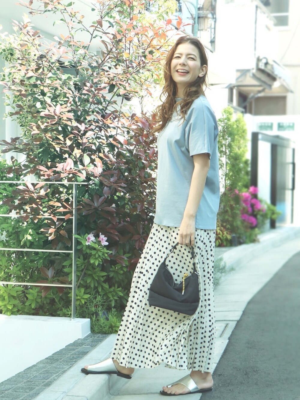 ラフな雰囲気のTシャツと、トレンドのドットスカートを合わせたコーデ♡ 足元にシルバーを持ってくると、甘くなりすぎないのでオススメだよ💕🌈 斜めのアシンメトリーデザインがかわいくて 大人っぽい、 セレンセクール のサンダルです❤️ デニムとも合わせて着たいな👖 TOPS:mango BOTTOMS:mango SHOES:serenececool
