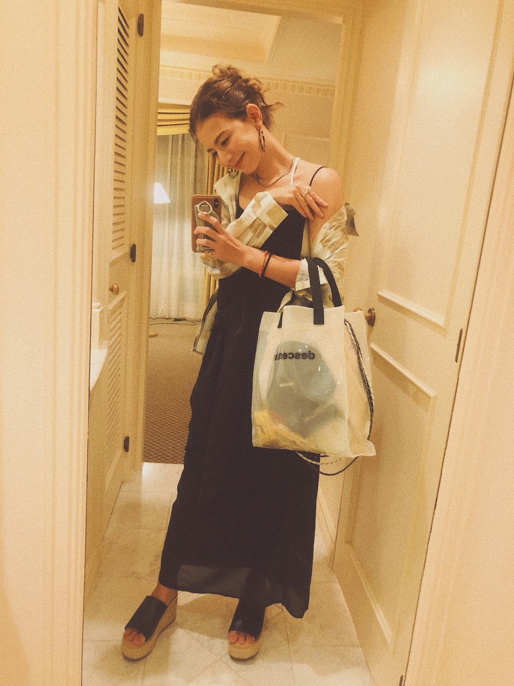 一泊(いや半日かな☺️) 東京出張のときの✈️ 透明バックだいすき♡ dcdt× elendeek コラボのこちら。 斜めがけも出来て、可愛くてお気に入り(カバンの中身スケスケだけど) ワンピとパットつき斜めインナーと 柄シャツは omekashi サンダルは👡 serenececool 結構歩いたけど、(空港うろちょろ久々すぎて迷子なりかけた) 全然足疲れなかった♡嬉。