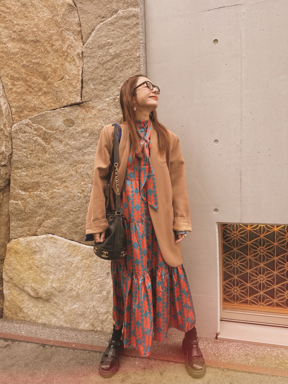 スザンヌのワンピース「<moyan ecri>総柄プリント リボン ロングワンピースlucky charm ribbon set print dress」を使ったコーディネート