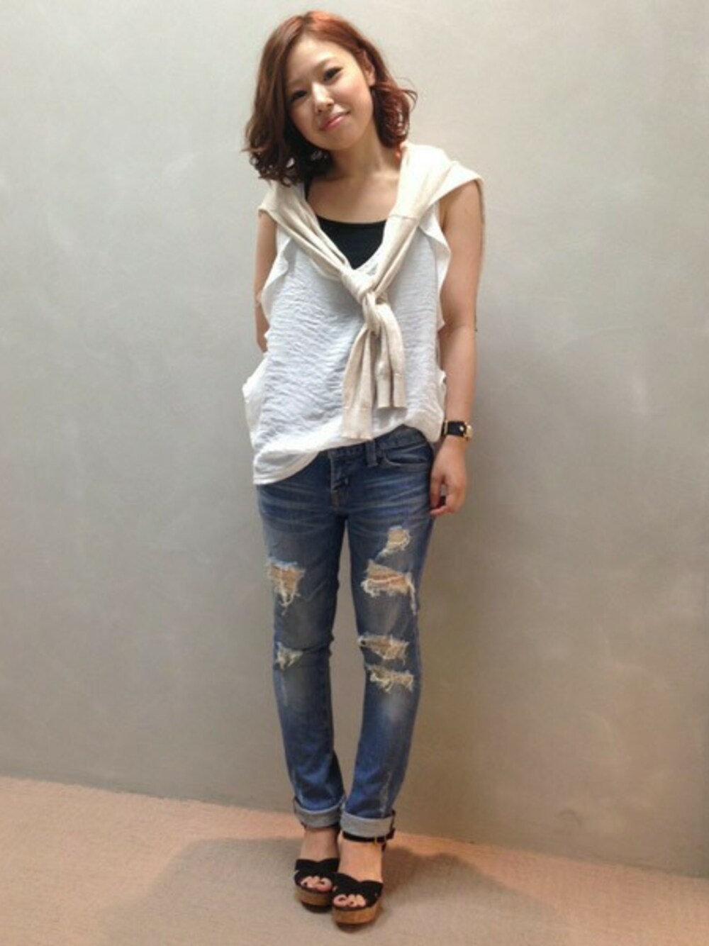 抜け感のある大人カジュアルなスタイリング。 ボリュームのあるコルクウェッジソールでトレンド感をプラスしました。