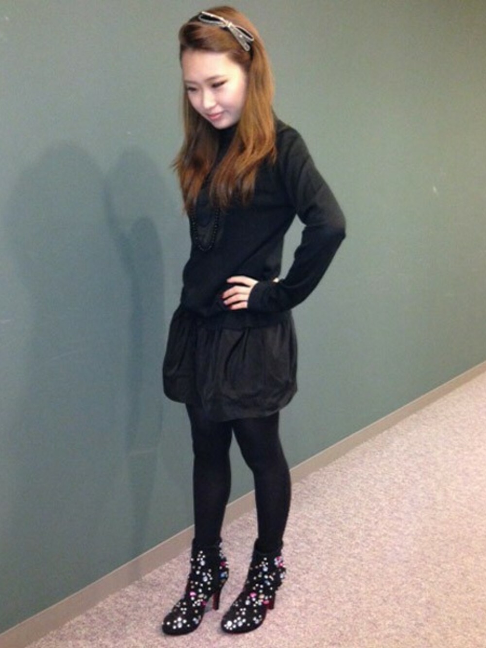 全身ブラックで上品にまとめ、ビジューブーツを主役にしました。 カラフルなビジュー使いが華やかです。