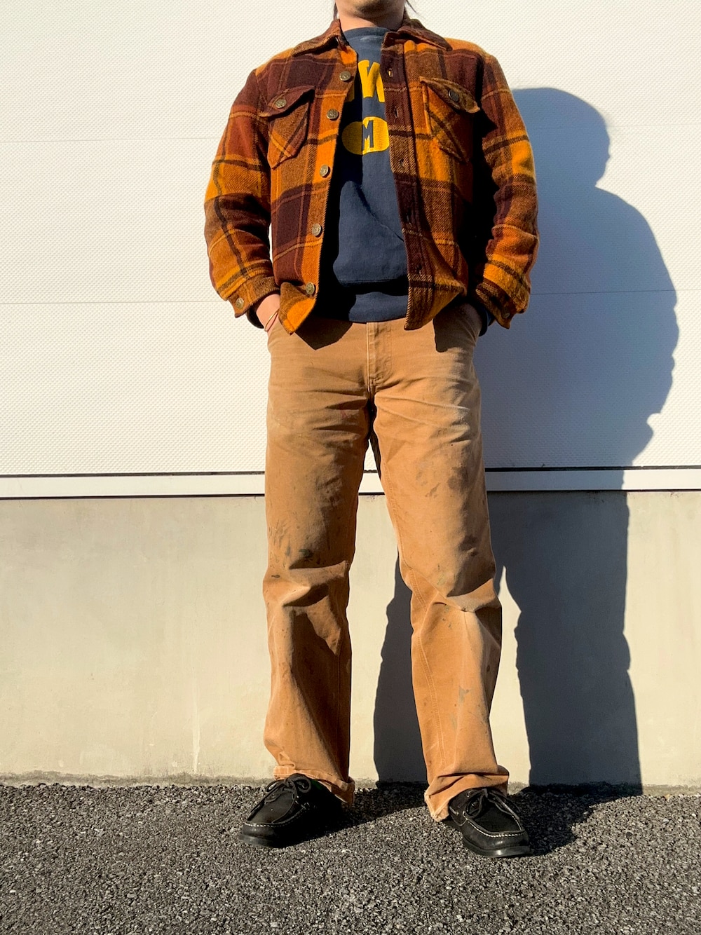 今日の出勤コーデ カラー →ネイビーの補色(互いに引き立て合う色)は オレンジっぽいカラー。 オレンジに近い同色系を着用しています。 アイテム →アウターとトップスは元々、スポーツウェアとして着用されていたもの。それぞれ年代が大きく異なるが使用目的が同じアイテムなので統一感がでているのかもしれない。 アウター SEARS 60S チェックジャケット トップス champion 90s リバースウィーブ revers weave カレッジ ボトム carhartt 90s ペインターパンツ シューズ paraboot デッキシューズ