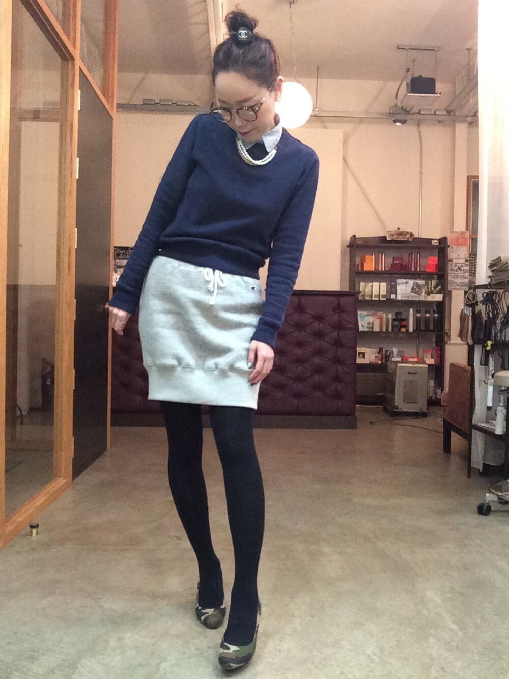 今日は、上下スウェットコーデにしてみたよ。 チャンピオンのスカートが、気になって購入、なかなかあったかいし、良い!スウェットだから、足元はカモフラパンプスにして、女子要素も入れてみました〜☻ ちょっと顔面が出てしまっているけど、気にしないで(笑)