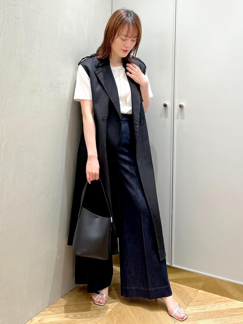 Tシャツ×デニムのシンプルスタイルに、ジレを羽織る事で一気に鮮度がアップします! ロングジレは羽織るだけで、お洒落&かっこよく スタイリングできるので大好きなアイテムです♪ カジュアルだけど、大人綺麗にみえるスタイリングにしたかったので、あえてモノトーンで組み合わせしました♪