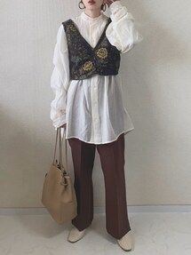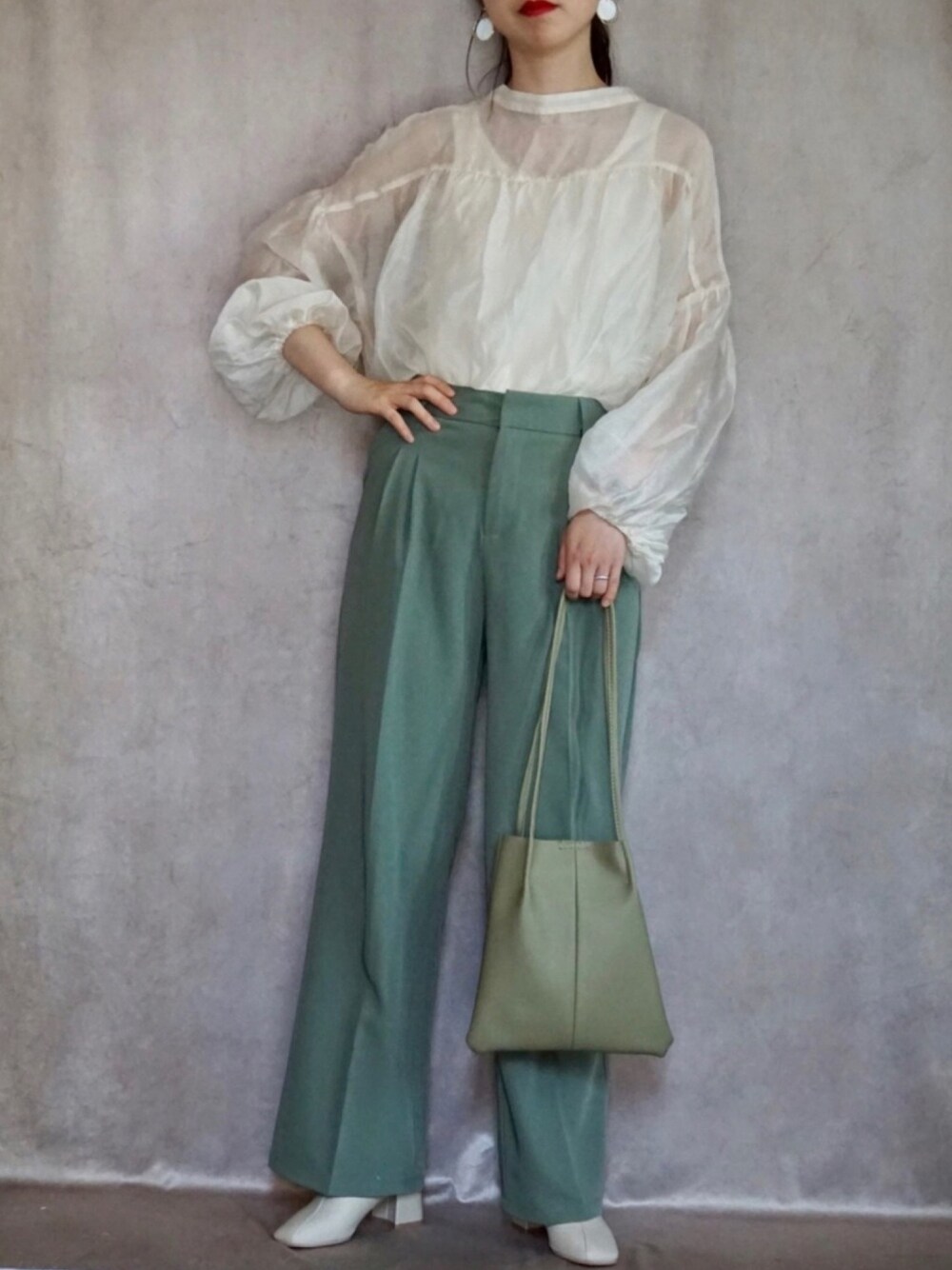 おはようございます☀ 大人気のselectMOCAさんのカラーパンツを着用させて頂きました。 このグリーンはやっぱりきれい〜 mysticさんのシアーシャツもシェルエットきれいでお気に入り。色は一番合わせやすいベージュです。 いつもご覧いただきありがとうございます〜