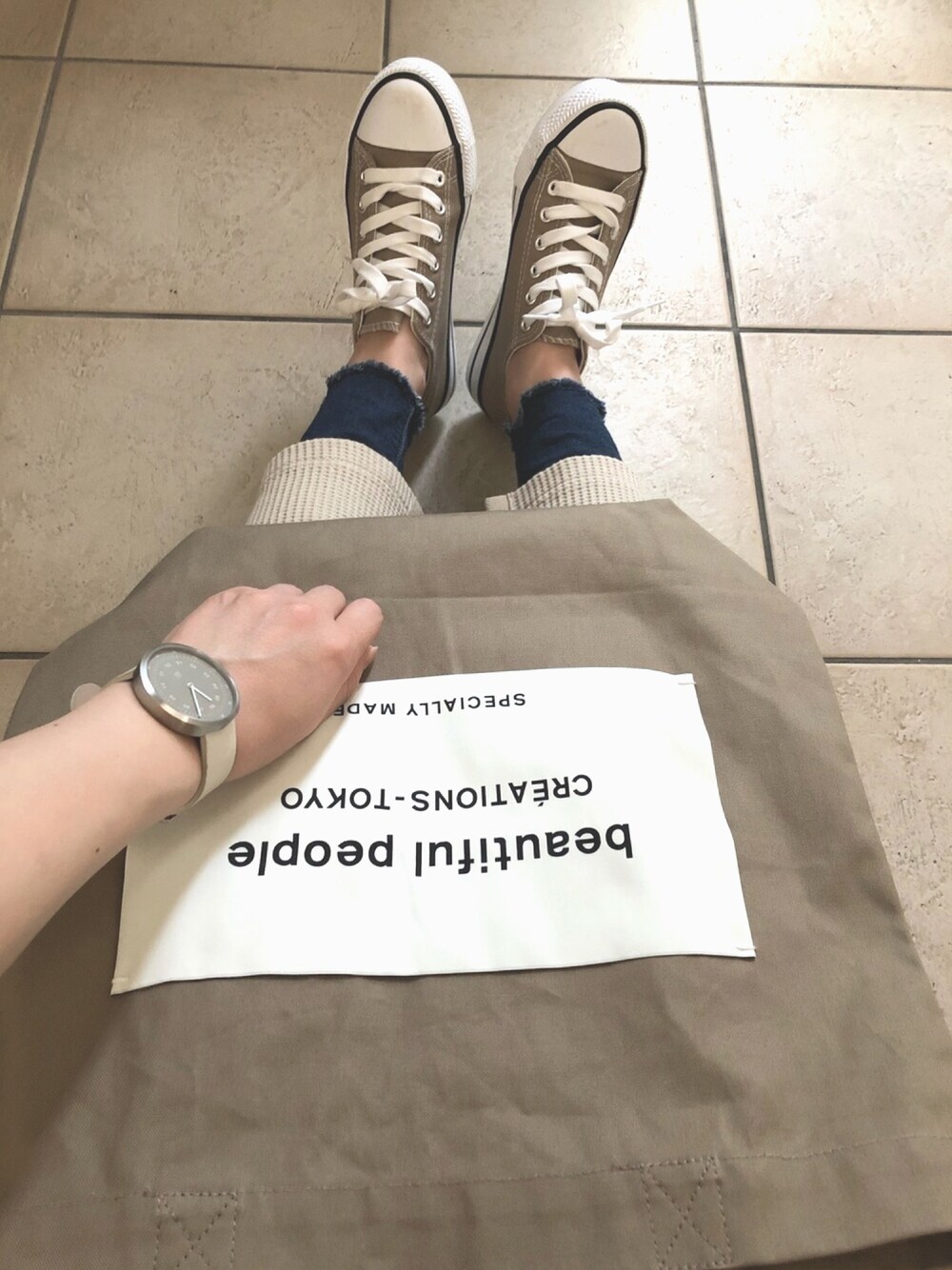 ベージュ小物攻め ベージュのスニーカーは コンバースと見せかけてスペプラ✌︎ beautiful peopleのバッグ 合わせやすくて◎