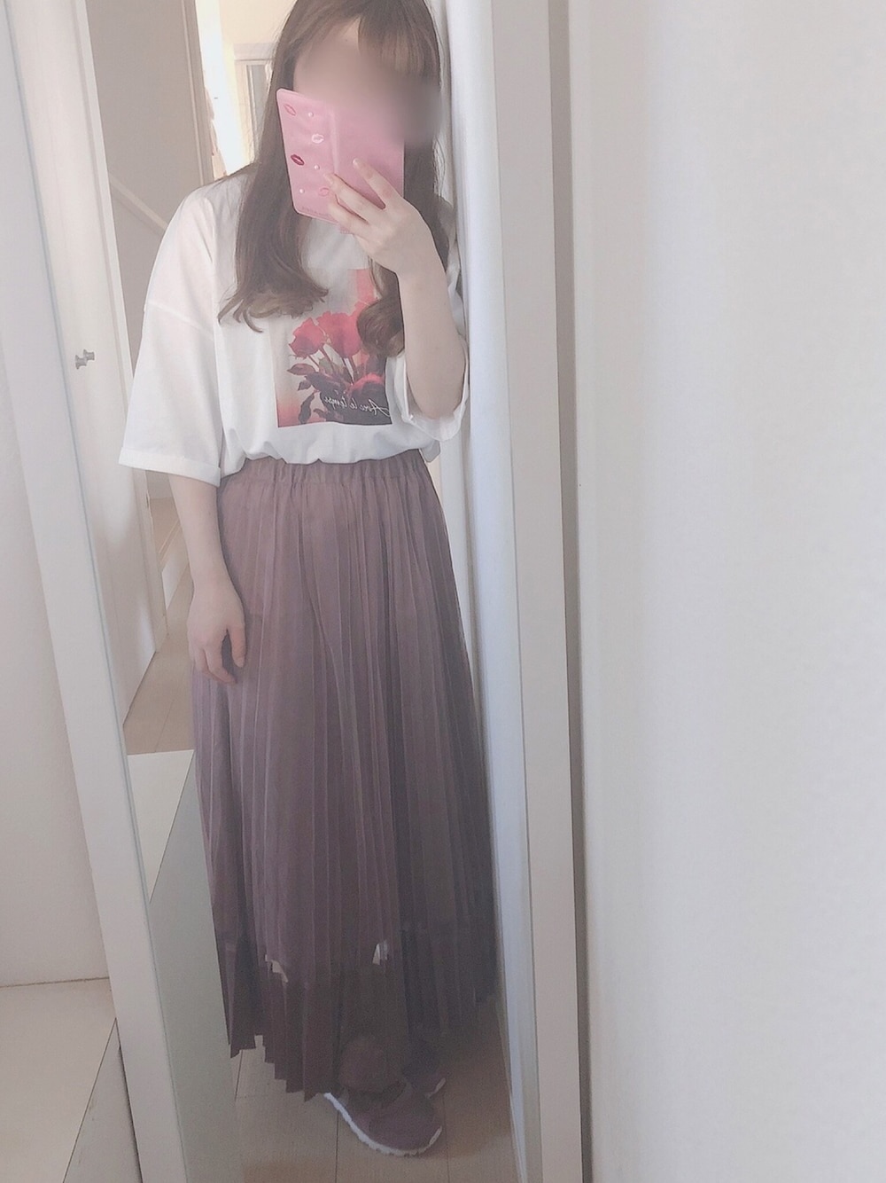 Tシャツ、スカート、スニーカー 1つ1つに甘め要素が入っているので甘カジュアル♡ バーガンディーのスニーカー 春に買ってやっと履いた✌︎