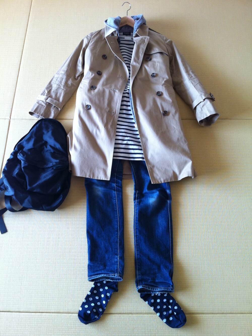 トレンチコート/無印 パーカー/ジムフレックス ワンピース/オーチバル デニム/ドミンゴ ソックス/マリメッコ