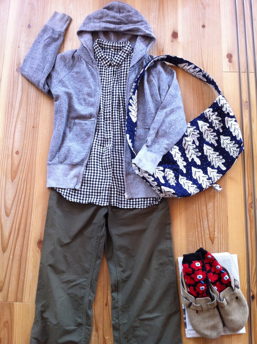 パーカー/ジムフレックス シャツ/無印 パンツ/n100 かばん/ミナペルホネン 靴下/マリメッコ くつ/ビルケン
