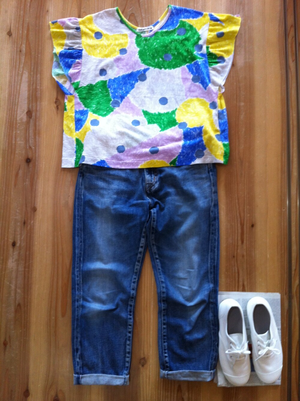 トップス/ミナペルホネン パンツ/DEEP BLUE 靴/無印良品 ミナの服、春らしいカラーでお気に入り♥︎ 着ると袖のふりふりがいい感じです^_^
