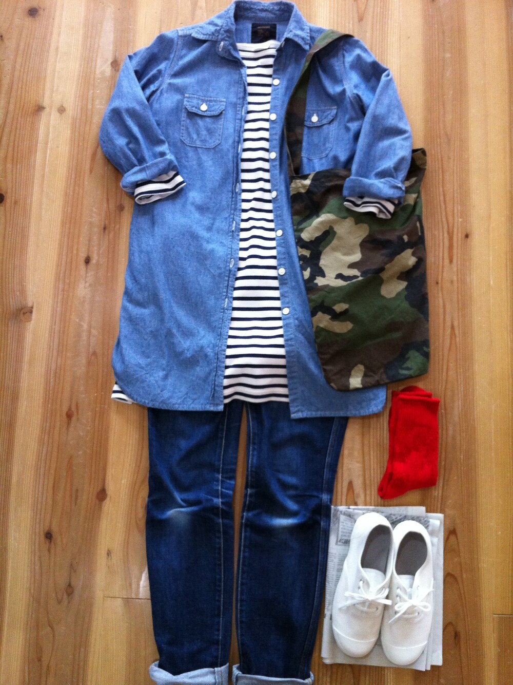 シャツ/miusa ワンピ/オーチバル デニム/dmg 靴下/フレンチブル 靴/無印 かばん/maillot