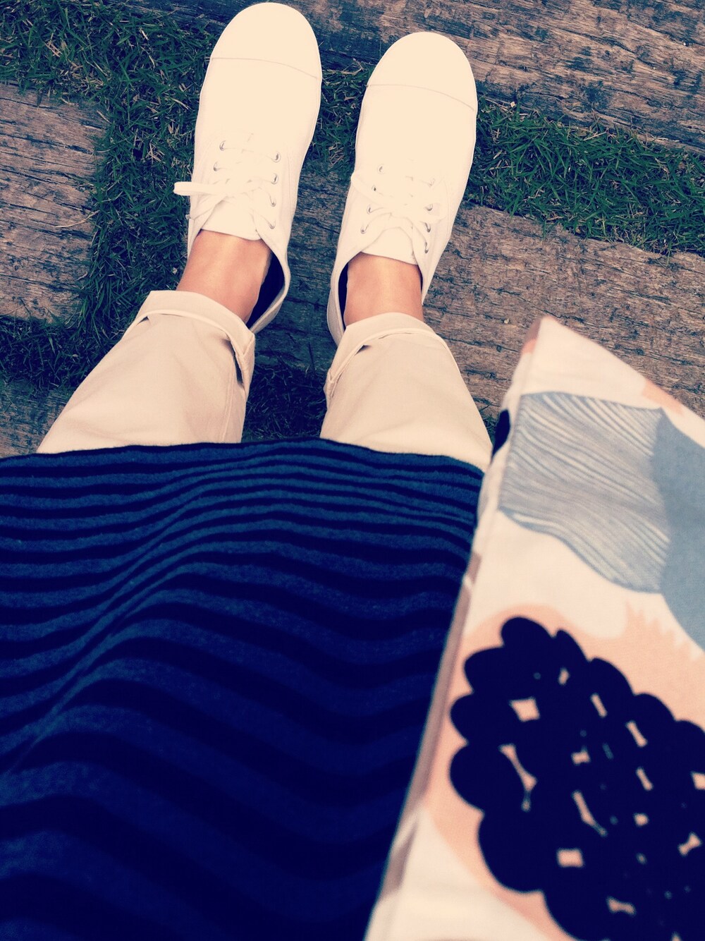 ブルー系のワンピース、ホワイト系のスニーカーを着用したレディースの春コーディネートの1枚目の写真
