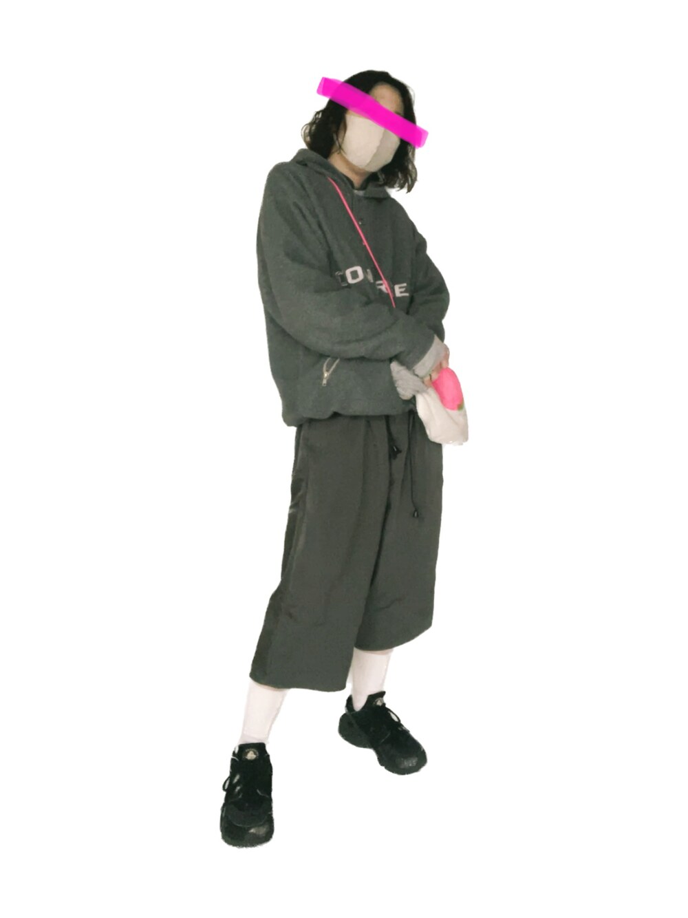 ブラック系のスニーカーを着用したレディースの冬コーディネートの1枚目の写真