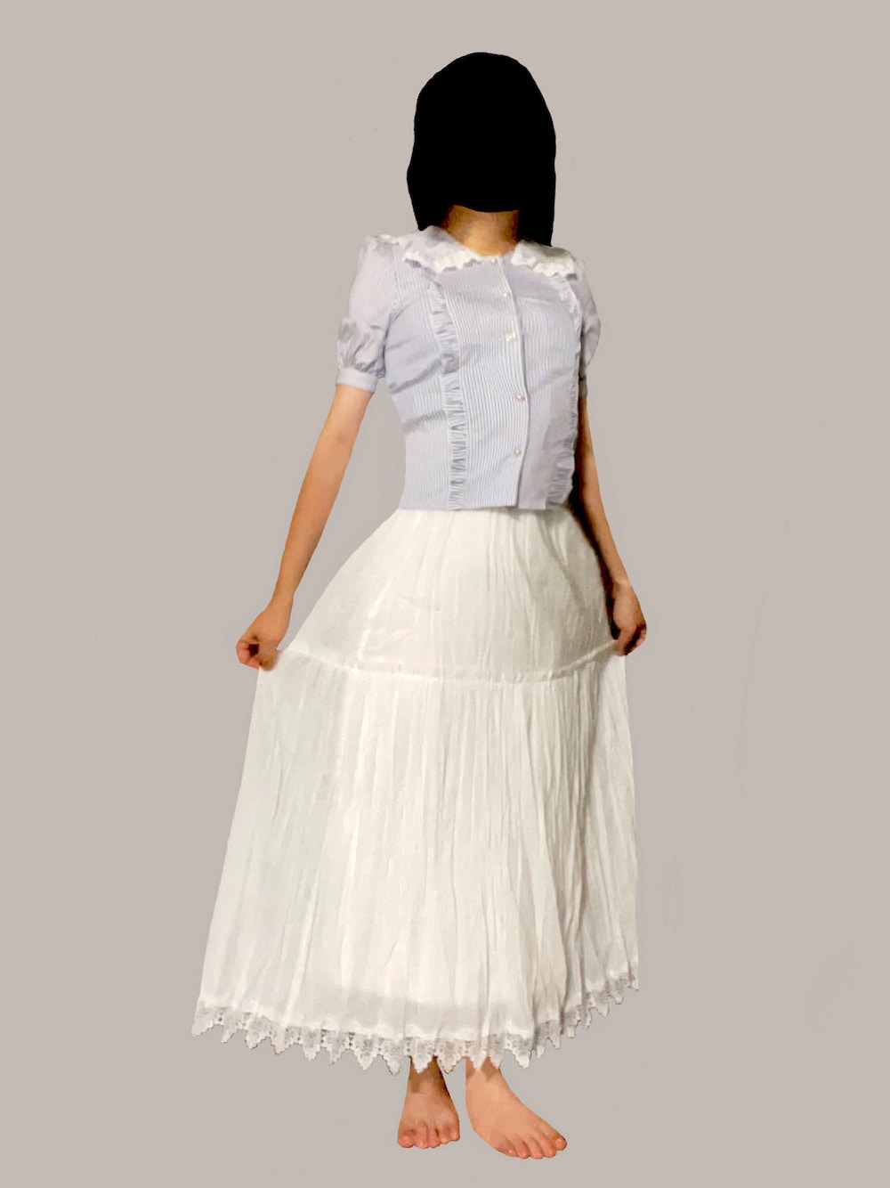 夏のお嬢様コーデ ブルーのセーラー襟のブラウスと白のロングレーススカートでお嬢様コーデの完成 ガーリーコーデでにもなる優れものです。