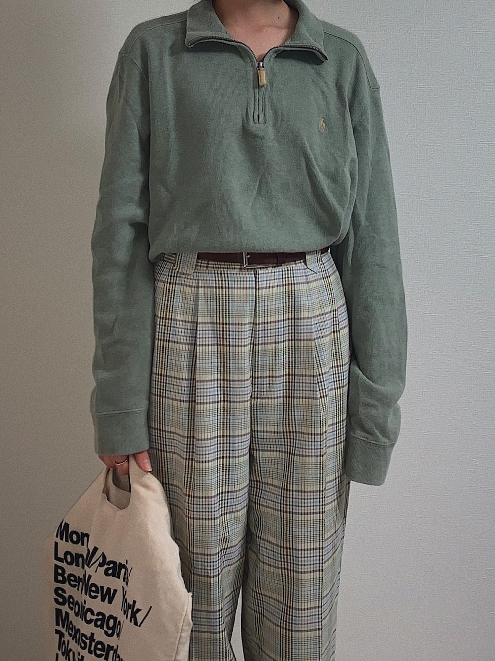 緑系でまとめて緑マンになりました。 パンツは2回ロールアップしてもでかいです。 【古着店名】 tops:GRAPEFRUIT MOON pants:3匹の子ねこ 【size】 tops:M pants:???