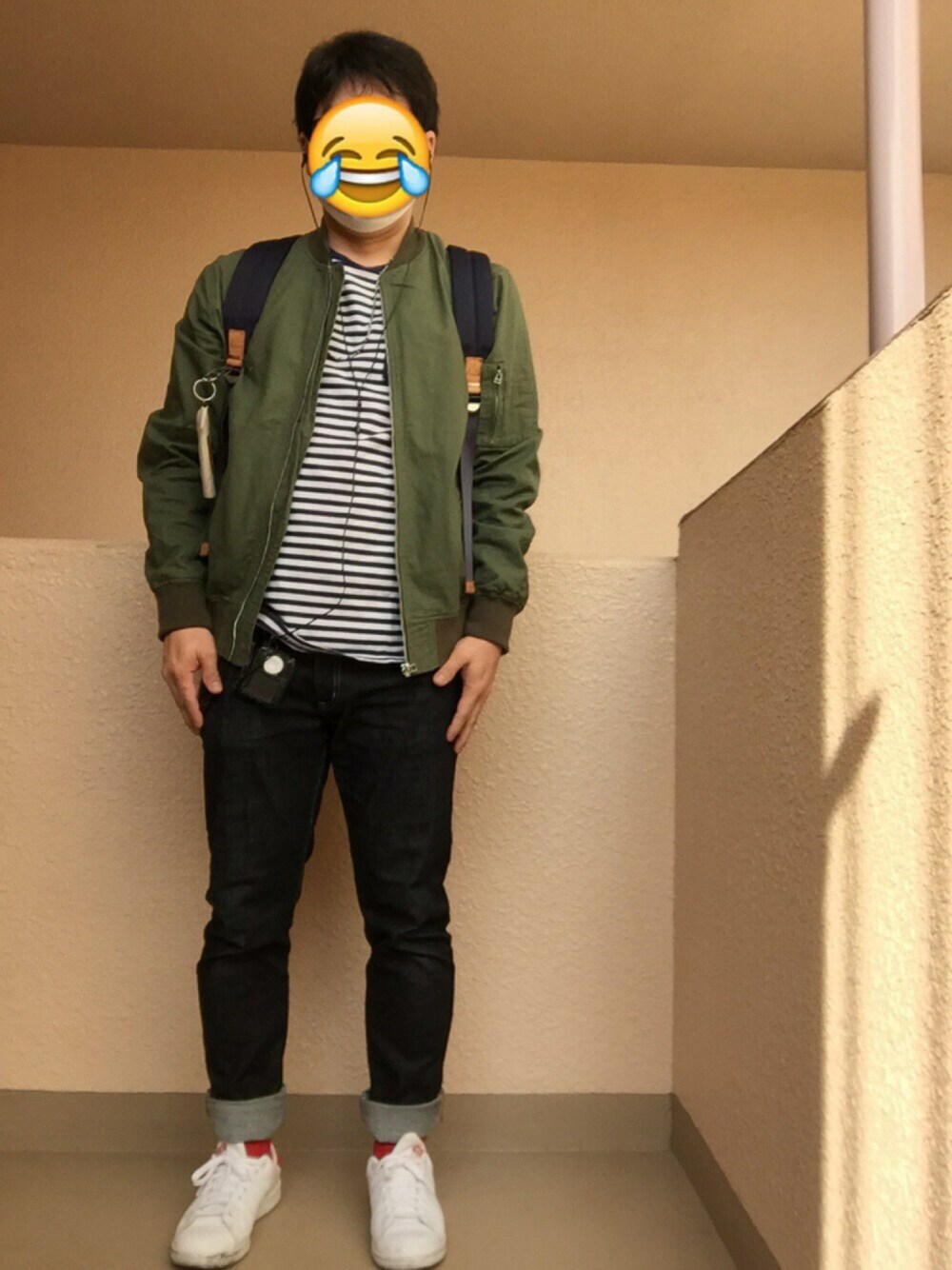 サラリ感が半端なく、二日続けて買ったMA-1コーデ。 そんな僕です。 昨日より暖かいので、中はしましまんず萌え隊のロンT一枚で。 チチカカのサルエル合わせたいけど、カーキ&カーキになってまう。 ネイビーのサルエルパンツ買おうかな〜😂 久々にアッソブのバックパックにしました。 いいネイビー😆
