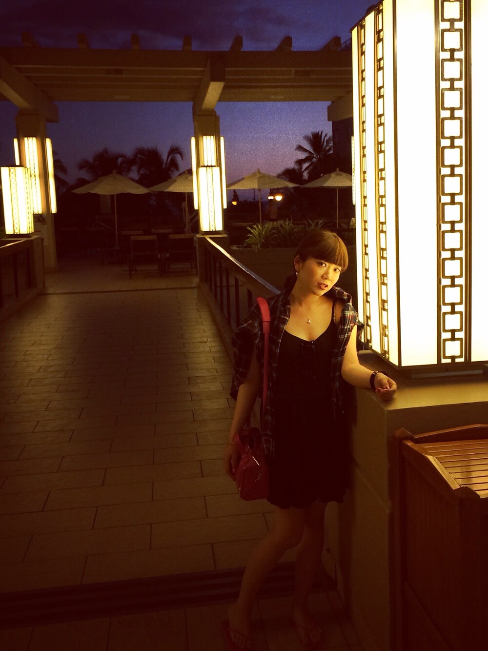 ハワイでの写真です♡ 足元はピンクのビーサンでした♡ チェックシャツでかしこまり感を和らげましたww この後美味しいディナーを堪能して来ました( ´౿` )