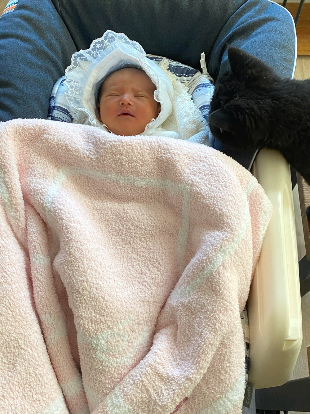 出生5日目。ベビードレスで退院を迎えました✨ カシウェアのブランケットはお祝いでいただく鉄板アイテムだけど、特にこの時期はほんとに色々使えて便利なアイテムでした。 にゃんこ初対面。 新入りに興味津々のにゃんこ。