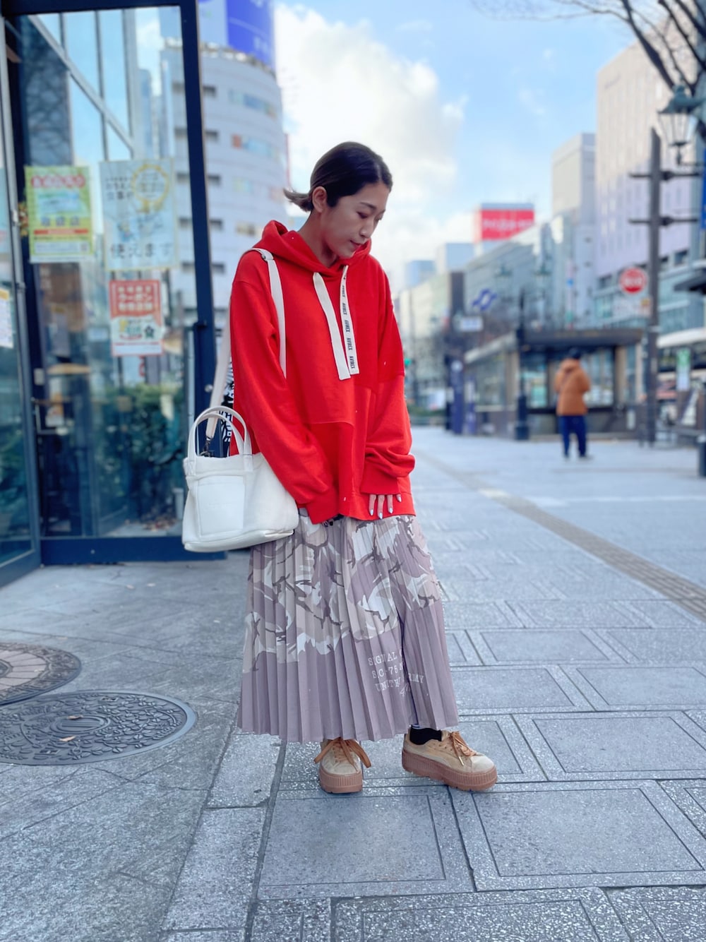 SAKIのスカート「プリーツカモ カラーコンビ カモスカート/ PLEATED COLOR COMBI CAMO SKIRT」を使ったコーディネート