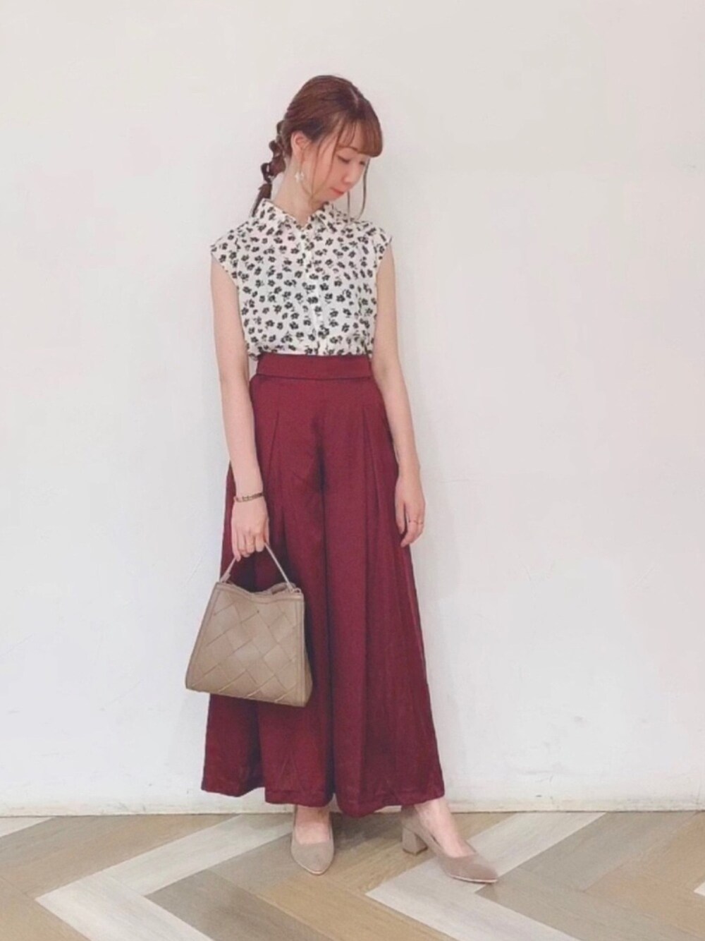 レトロな花柄が魅力の ノースリーブのブラウス🌼 まだまだ暑いのでノースリで涼しげに🍃 でもボトムにボルドーをもってきて 秋物っぽく🍁 足元もサンダルだと一気に夏感でてしまうので パンプス合わせにしました👠✨ ブラウスは衿つきの前開きなので ボタンの開け方や抜き方によって 雰囲気が変えられます☺️♬