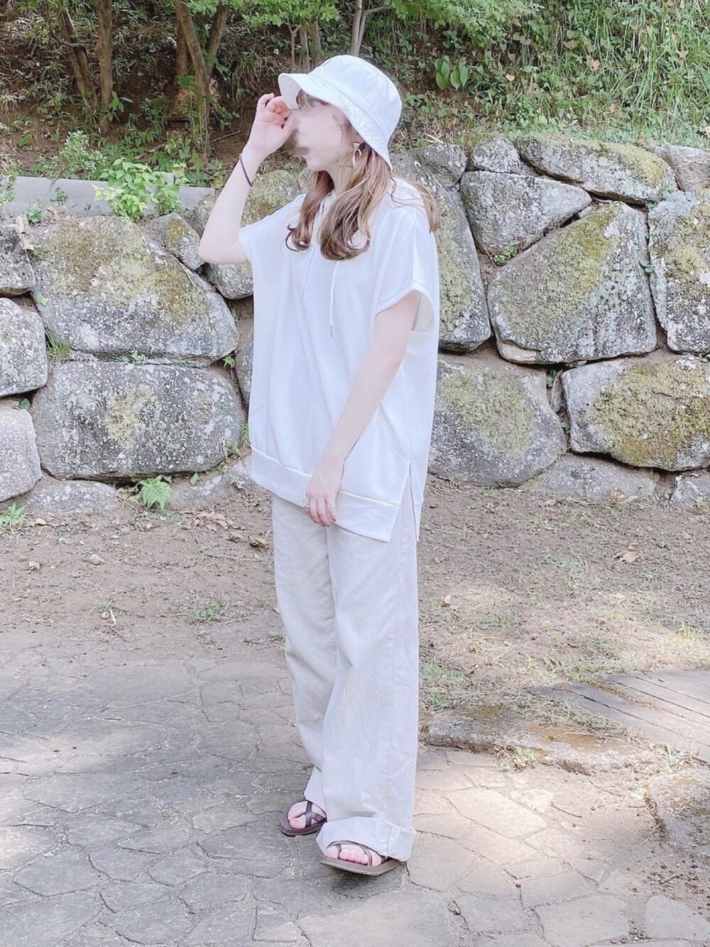 ホワイトコーデ! 初めてバケハ被ってみました🧢 Instagram変わったので 良かったらフォローお願いします🌼 komi___wear