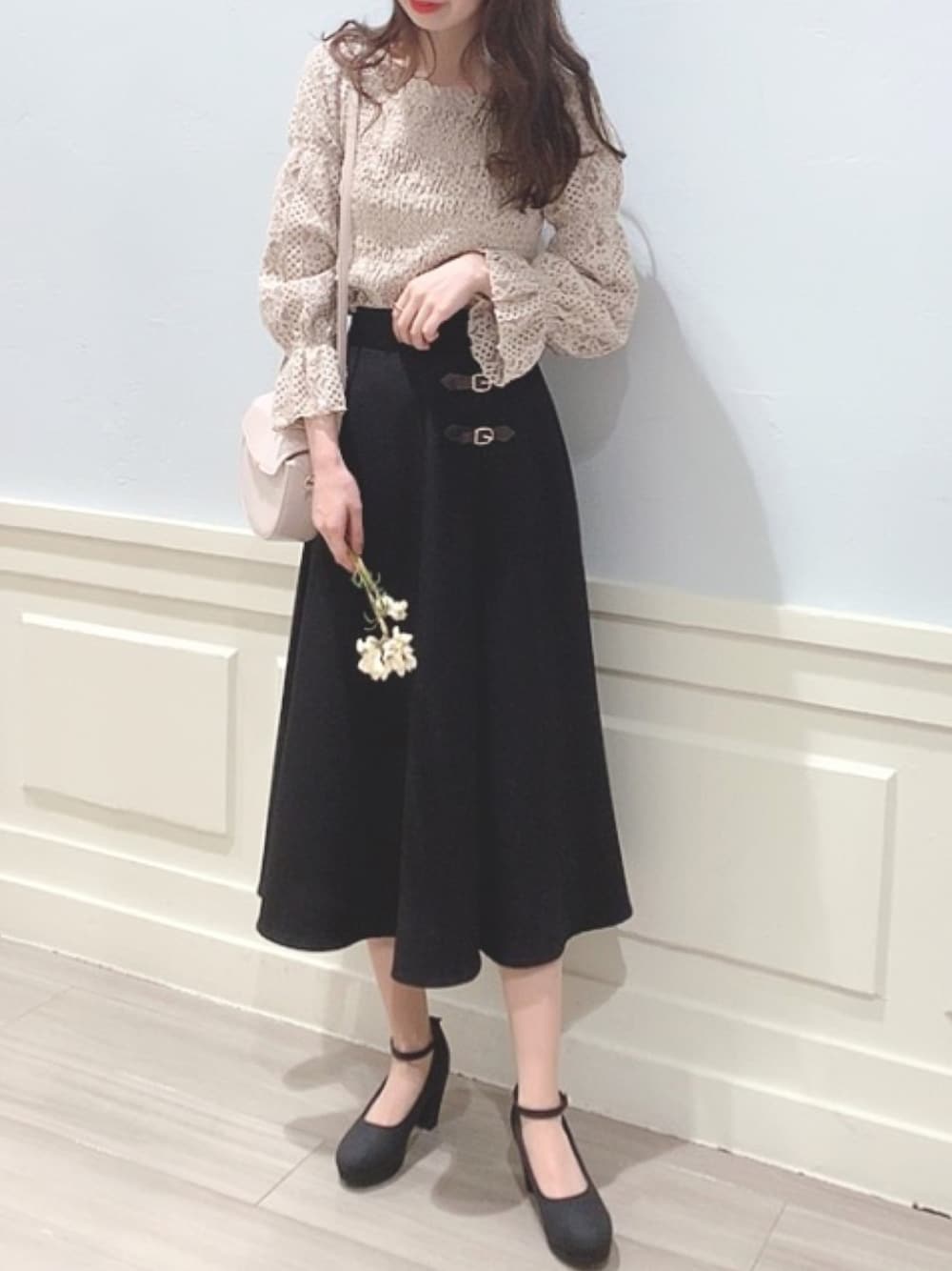 袖のフリルが可愛いレースブラウス💕ブラックスカートでまとまり感🙆♀️
