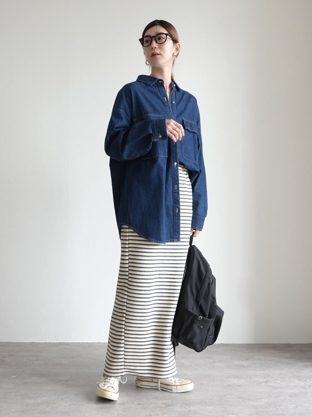 reca ▶デニムシャツジャケット ▶パイル配色ボーダーナロースカート instagram @reca.zozotown