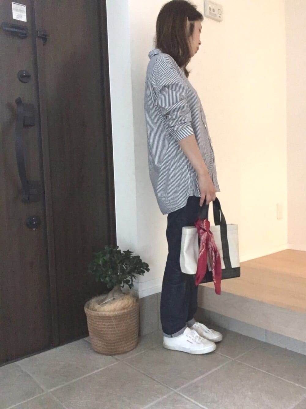 スペルガのスニーカーのタグの赤と… 赤いスカーフ。 トリコロールカラーのコーデです。
