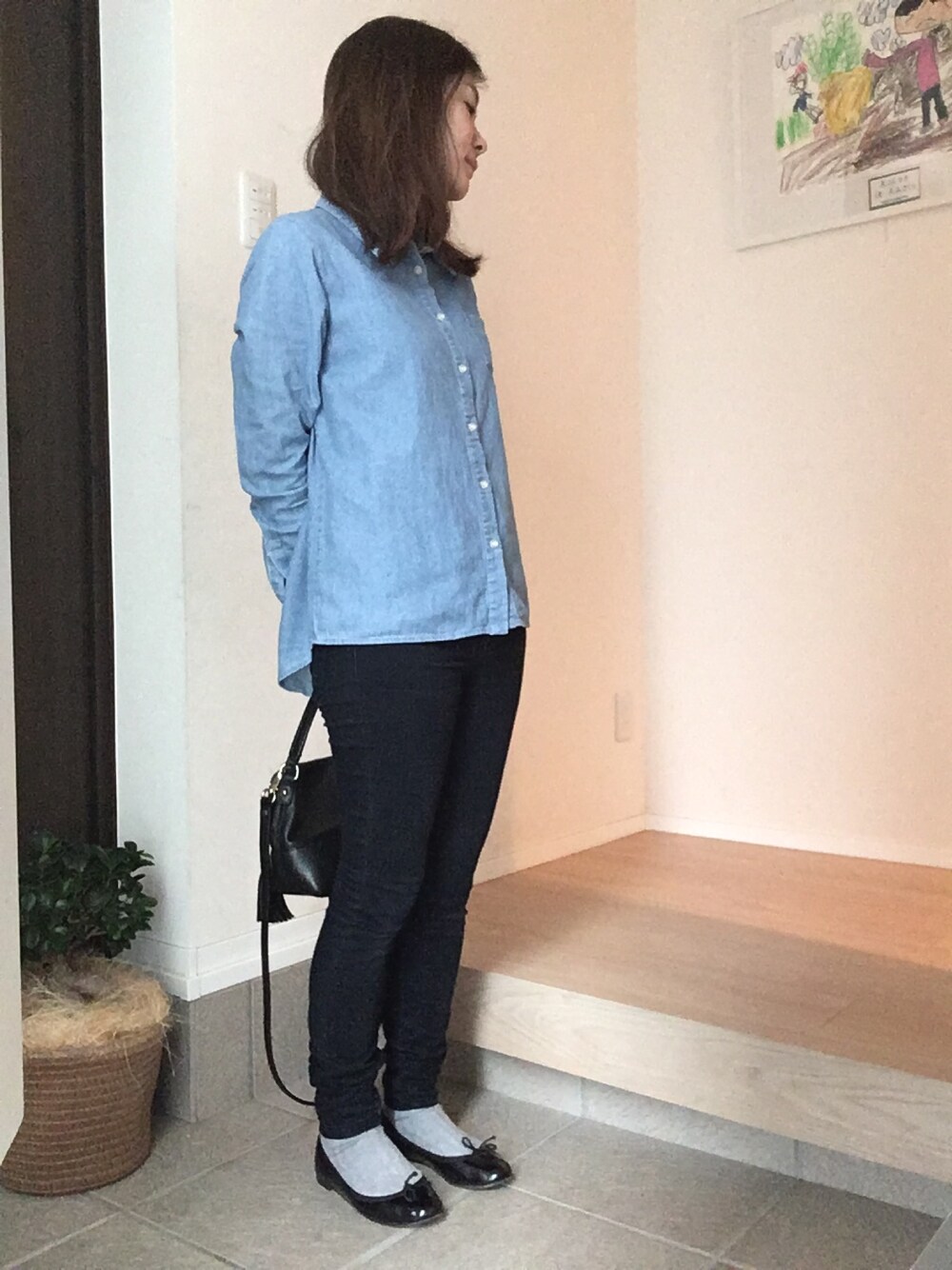 雨の日の青 デニムシャツに黒スキニーパンツで、 定番コーデです。 配色が好き。 靴とかばんで女の子ぽく。