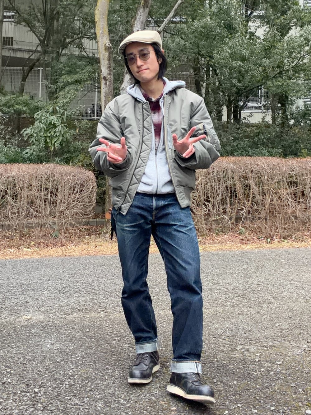 MA1とパーカー、デニムを合わせた王道アメカジコーデ! ワイパーの最初機型のMA1のディティールが調子いい!