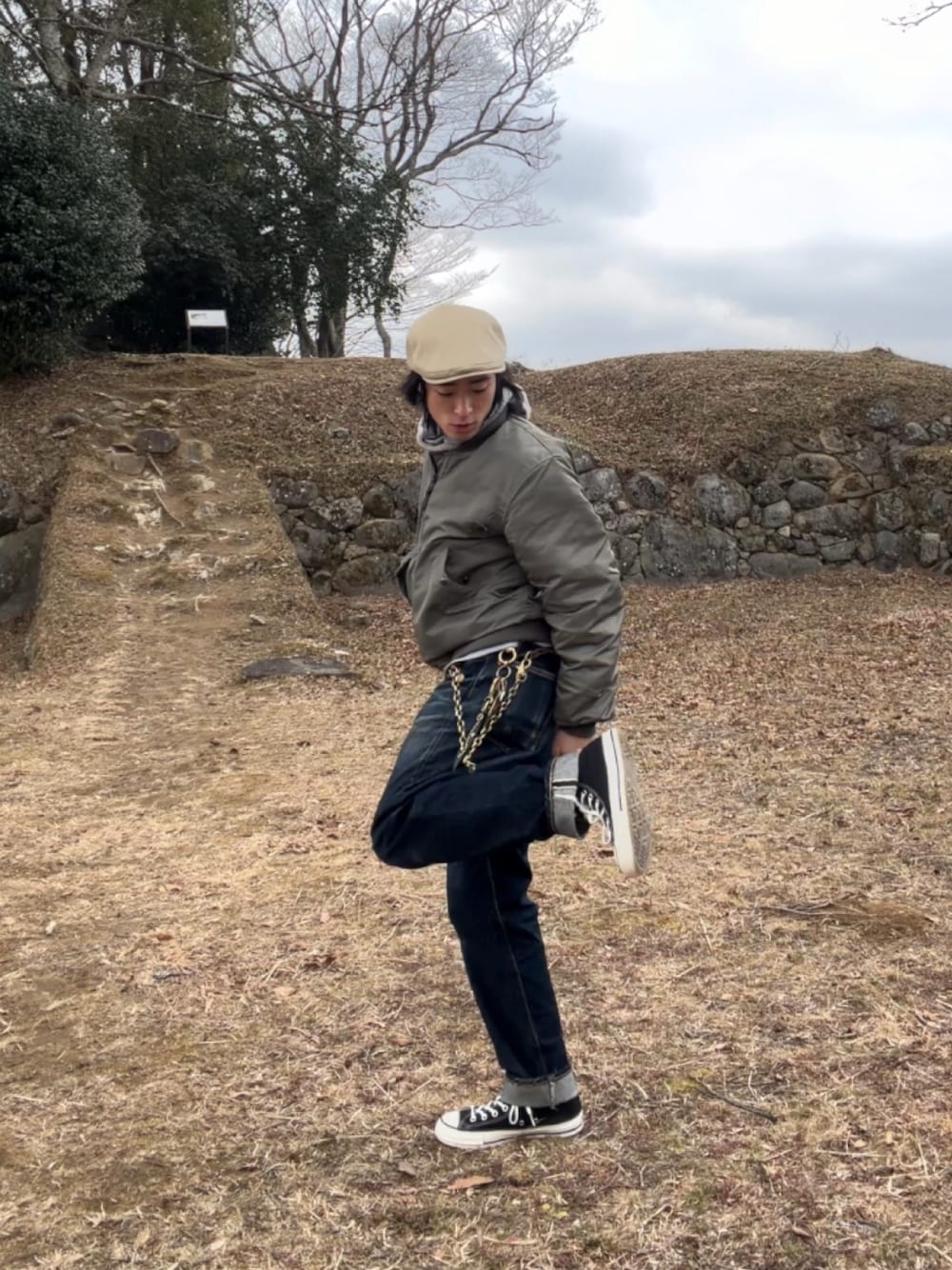 着替えを減らすために利便性重視だけれども、王道アメカジコーデになるようにコーディネート! インナーのパーカーは首元まである珍しいタイプでマフラーなくても余裕! おじちゃんからもらったコンバース、早くボロボロにしたい👟