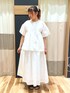 ポコポコ素材のドビーパッチワークのセットアップです! ブラウスは袖がフレアになっており、レースも控えめなのでナチュラルに着ていただけます◎