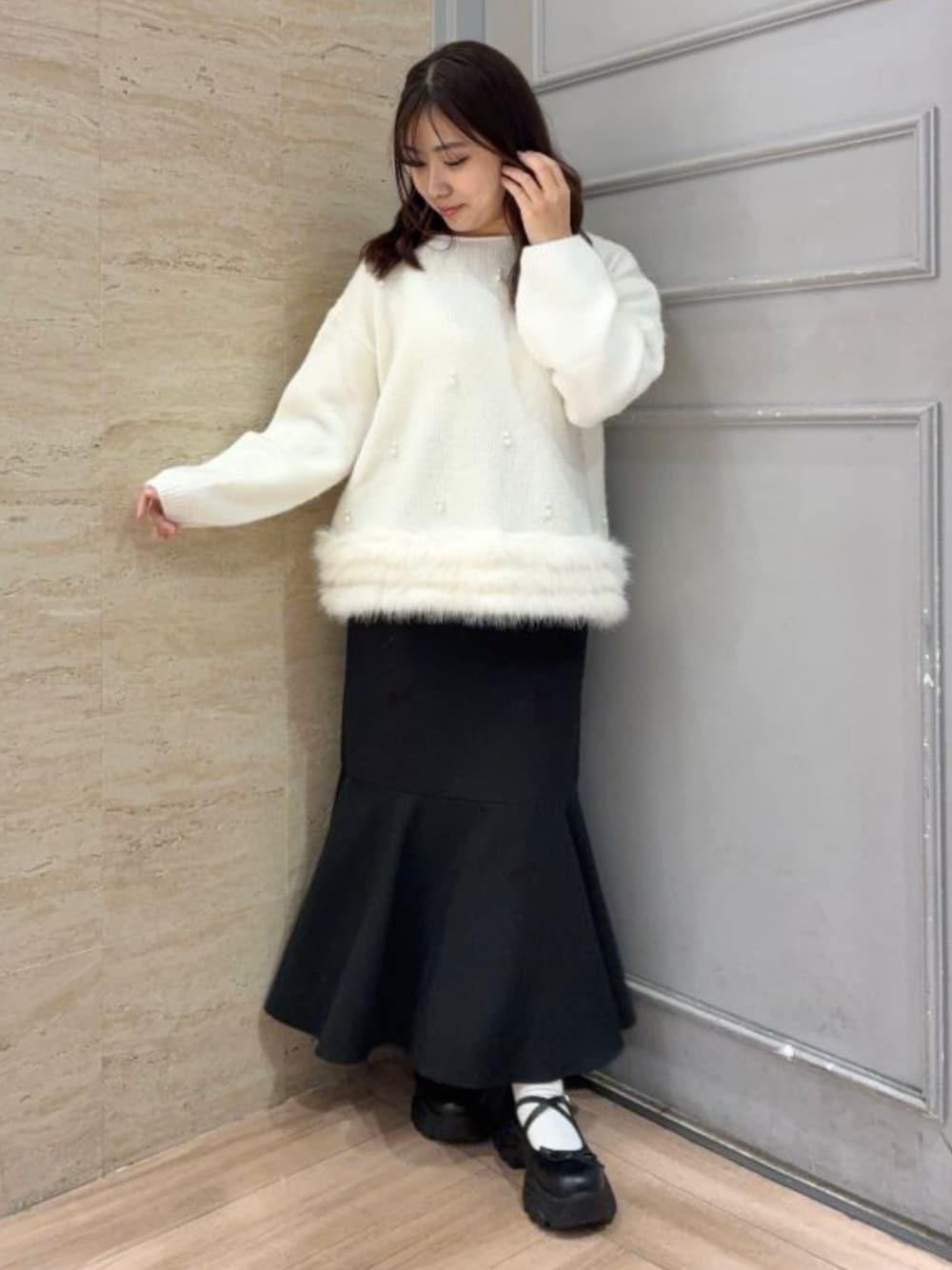 パールが散りばめられた上品なニットに、シルエットの綺麗なマーメイドスカートを合わせて大人らしくもあざとかわいいモノクロコーデです♪ 裾のファーがなんとも冬らしく他にないニットです☺︎ 《着用サイズ トップス:M ボトム:S 》